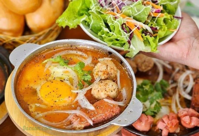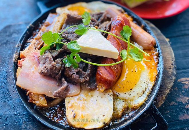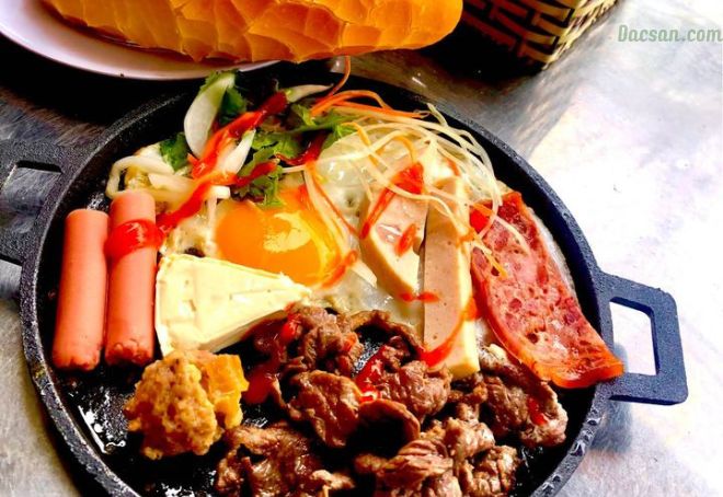 - Bước 5: Chuẩn bị một chảo chuyên dụng – loại chảo chuyên dùng để làm món bánh mì chảo, cho vào đó xúc xích, pate, thịt bò, khoai tây chiên… rồi rưới nước sốt vào. Ăn kèm cùng với ổ bánh mì nóng giòn.