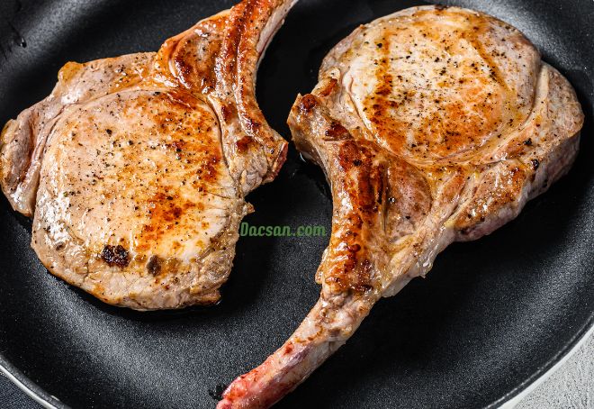 Với sườn cốt lết, ướp với chút gia vị cho thơm ngon, vị đậm đà. Sau đó đem áp chảo hoặc chiên. Khi miếng sườn xém vàng là đạt thành phẩm.
