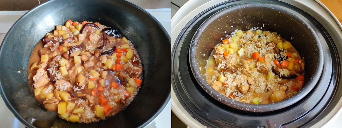 - Tiếp theo, thêm lượng gạo đã vo sạch và lượng nước thích hợp vào đảo qua, rồi đổ vào nồi cơm điện. Nhấn nút cook và nấu cơm như bình thường.