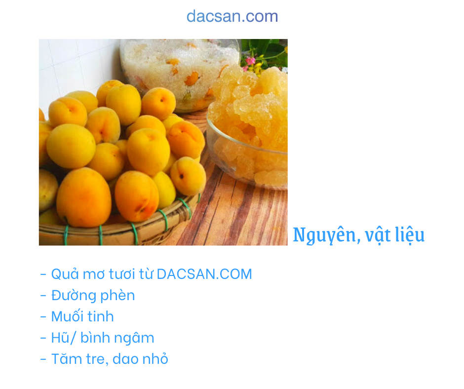 Mơ ngâm đường phèn có nguyên liệu chính là mơ tươi ngâm cùng đường phèn ngọt thanh, sau 1-3 tháng cho ra thứ nước uống chua ngọt, mát dịu.
