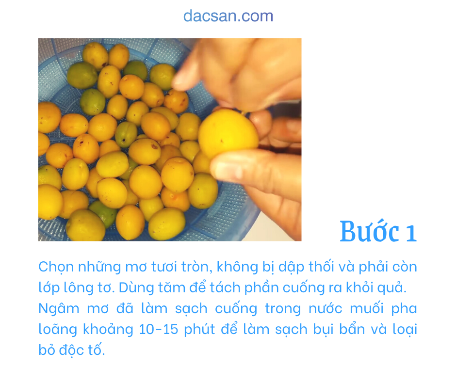 B1: Bạn nên chọn những mơ tươi tròn, không bị dập thối và phải còn lớp lông tơ. Bạn nên sử dụng tăm nhọn để lấy phần cuống mơ thì sẽ nhanh hơn mà không làm hỏng mơ.
