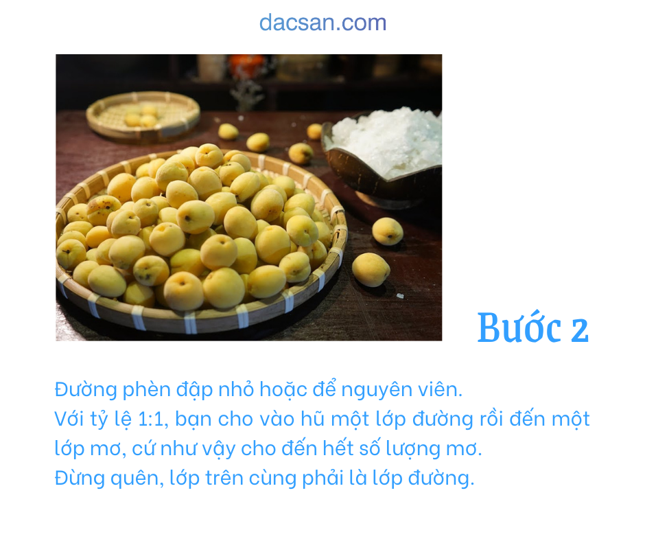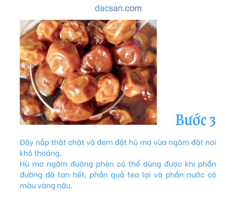 B3: Đường phèn bạn có thể đập nhỏ hoặc để nguyên viên. Với tỷ lệ 1:1, bạn cho một lớp đường xuống đáy rồi đến 1 lớp mơ, cứ như vậy cho đến hết mơ và lớp trên cùng là một lớp đường bạn nhé! Đem đặt bình mơ ở nơi khô thoáng. Mơ có thể dùng được khi phần đường đã tan hết, phần quả teo lại và phần nước có màu vàng nâu.