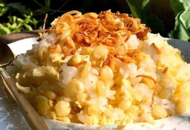 Bước 7: Cho xôi bắp ra đĩa, thêm đậu xanh, rắc hành khô và muối mè lên trên rồi thưởng thức. Xôi bắp dẻo thơm, dậy vị rất ngon.