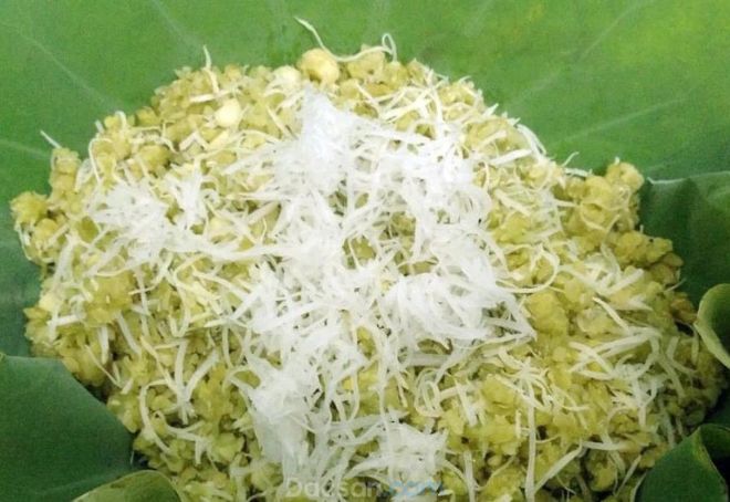 Bước 3: Hoàn thiện món xôi cốm. Cho cốm ra đĩa, thêm đậu xanh, đường và dừa nạo trộn đều. Ăn kèm với chả cốm cũng rất tuyệt.