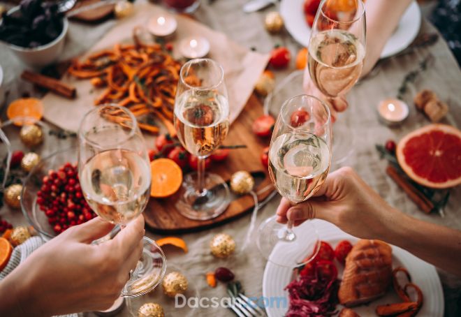 Một bữa tiệc Giáng sinh không thể thiếu các đồ uống để cùng nâng ly gửi đi thông điệp chúc mừng. Rượu vang đỏ và rượu sâm banh thường là lựa chọn phổ biến cho tiệc Giáng sinh. Ngoài ra, rượu mơ, các loại cocktail cũng rất phù hợp với mùa lễ hội.