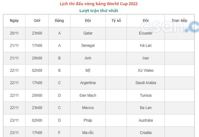 Lịch thi đấu World Cup 2022 diễn ra từ ngày 20/11 đến 18/12/2022, tại Qatar. Trong ngày 20/11, trận đấu đầu tiên là Qatar – Ecuador (bảng A) vào lúc 23h.